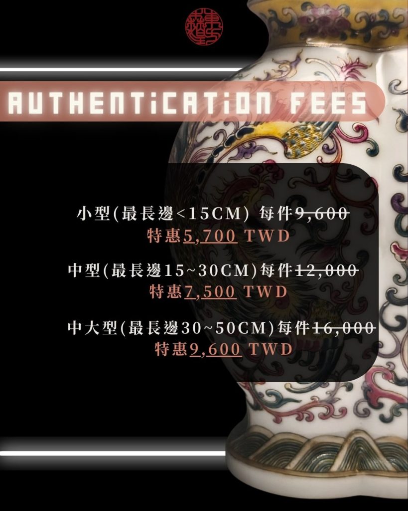 本技術不僅能運用於中大型瓷器,而過去無法鑽孔檢測的薄盤、精緻小器,現在亦得以驗明正身。更棒的是,同樣具有證據力的科技檢測,現在費用比過去降低了50%~60%以上 ! 依照器物尺寸(最長邊)不同,鑒定費用原價從台幣9,600~16,000元不等。比過去動輒20,000~30,000元的科技鑑定費用,大幅減輕了收藏家/文物商家的負擔。此外,新上市期間,同享6折優惠~折扣後價位,請見下方圖表。